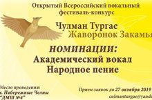 Начался прием заявок на участие в Открытом Всероссийском вокальном фестивале-конкурсе «Чулман тургае - Жаворонок Закамья – 2019» номинация "Академический вокал", "Народное пение" (Соло. Вокальные ансамбли), который состоится 30 октября 2019 в МАУДО "ДМШ №4" г. Набережные Челны.