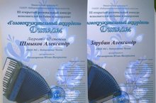 Поздравляем учащихся народного отделения с успешным выступлением на III открытом региональном конкурсе исполнителей на баяне и аккордеоне. Лауреаты III степени: Шмыков Александр. Анисимов Макар Дипломант конкурса: Зарубин Александр. Преподаватели:Ю. В. Поликарпова. Г. Г. Фирсова.