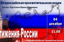 ПРОСВЕТИТЕЛЬСКАЯ АКЦИЯ "ДОСТИЖЕНИЯ РОССИИ" ПРОЙДЕТ 4 ДЕКАБРЯ в 11.00 В НАБЕРЕЖНОЧЕЛНИНСКОМ МЕДИЦИНСКОМ КОЛЛЕДЖЕ. 02.12.2023