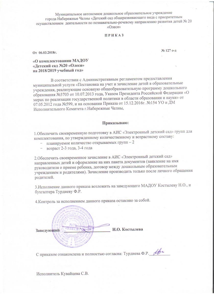 Приказ «О комплектовании МАДОУ «Детский сад №20 «Олеся» на 2017/2018 учебный год