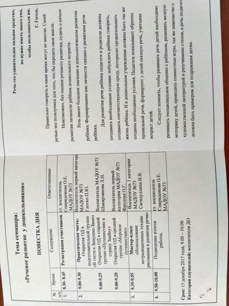 Опубликовано: 15.12.2017Тема семинара: "Речевое развитие у дошкольников". На повестке дня заявлено: регистрация участников; практическая часть - открытое ОД в подготовительной группе на тему "В гости к Зимушке -Зиме", открытое ОД в старшей группе на тему "Путешествие в страну Знайку" и средней группе на тему "Морское путешествие"; мастер-класс на тему "Использование нетрадиционных техник рисования в развитие речи". Подведение итогов работы участников с традиционным чаепитием.