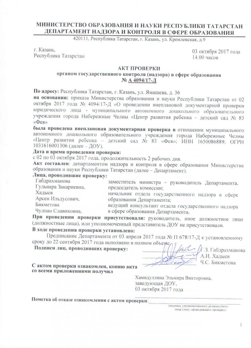 Акт проверки органом государственного контроля в сфере образования от 03.10.2017г.