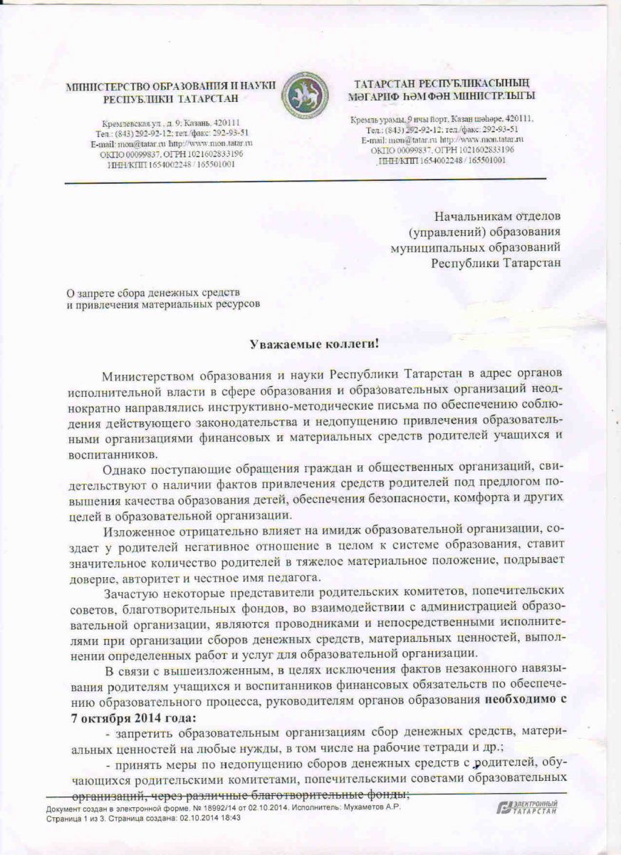 Письмо "О запрете сбора денежных средств и привлечения материальных ресурсов"
