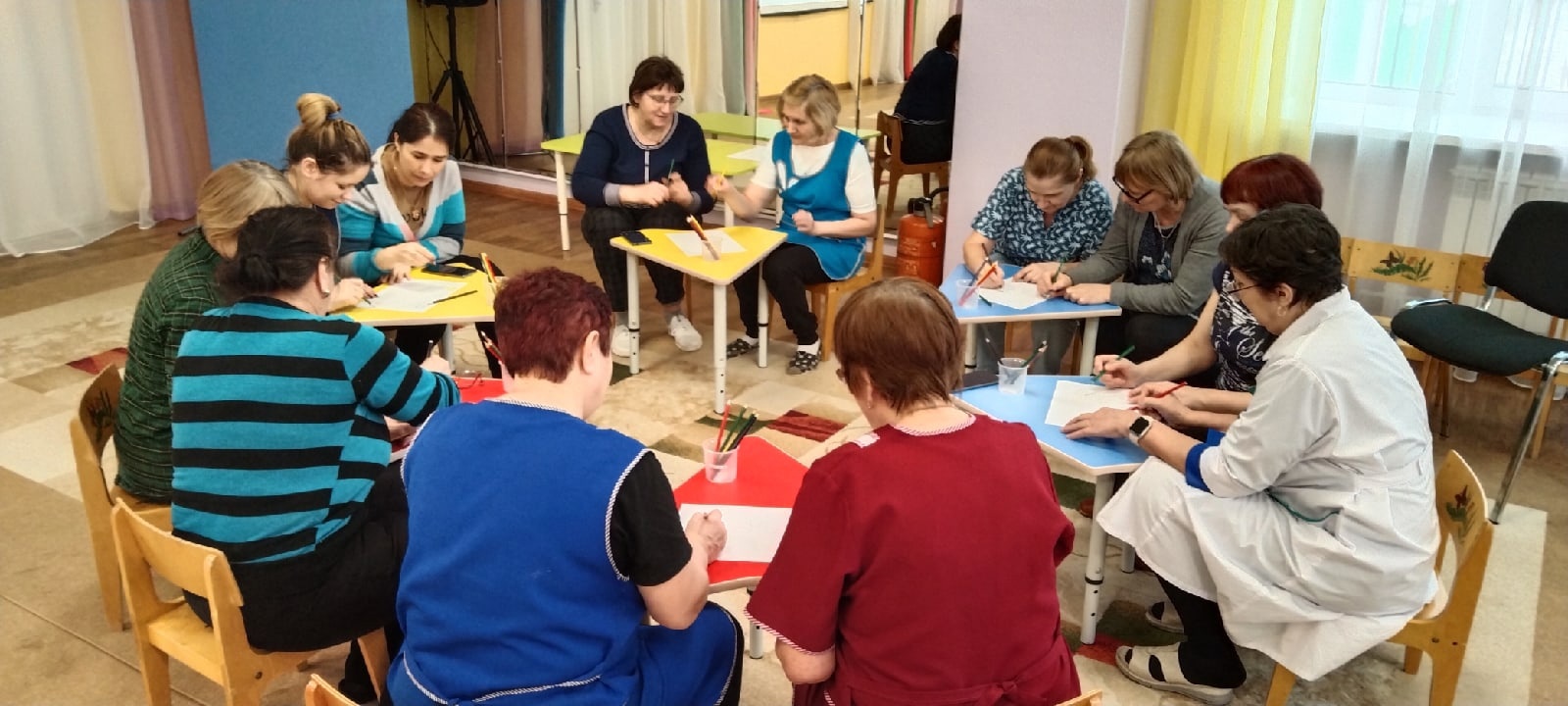Психологический климат в коллективе очень влияет на каждого сотрудника. Одни хотят убежать поскорее, а другие бегут на работу с радостью. Человек,который излучает свет , дарит свою улыбку, меньше всего подвержен попасть в конфликтную ситуацию. Сегодня в ДОУ 9 "Алан" прошел Воркшоп "Управление конфликтами" или "от улыбки станет всем светлей". Ежегодно , при поддержке МЦ "Орион", проводится данный Воркшоп для родителей и педагогов. Но,в этом году,участниками стали младшие воспитатели и другие сотрудники. Ведущий, педагог-психолог, Овчинникова Зиля Флюровна, провела игры на снятие тревожности, сближение, на взаимодействие в парах и в команде, с помощью тестов, участники раскрыли свои внутренние качеств. А в завершении выполнили практику "Внутренняя Улыбка" и подарили друг другу комплименты и добрые пожелания.
