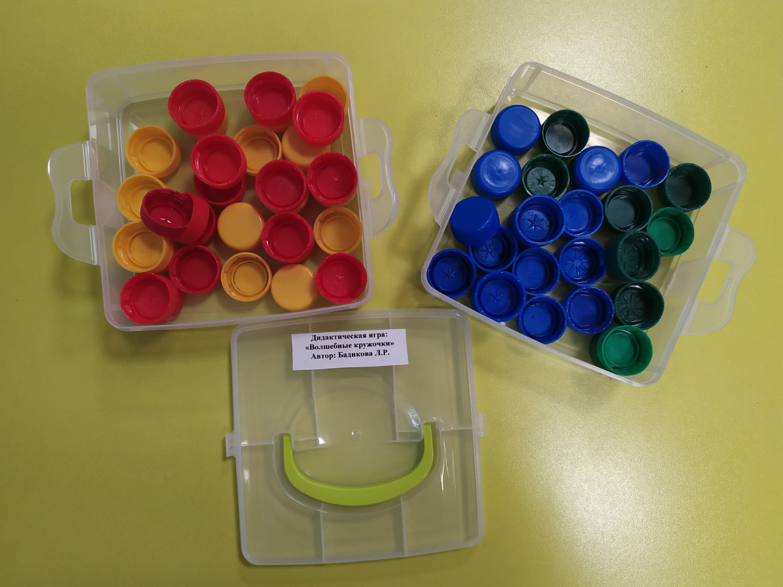 Воспитатель нашего детского сада Бадикова Л.Р. приняла участие в конкурсе "Экофентази". На конкурс она представила игру из разноцветных пластиковых пробок и карточек. Данное пособие можно использовать с группой детей, подгруппой и индивидуально. Игра предназначена для детей от малышей до подготовительной группы.