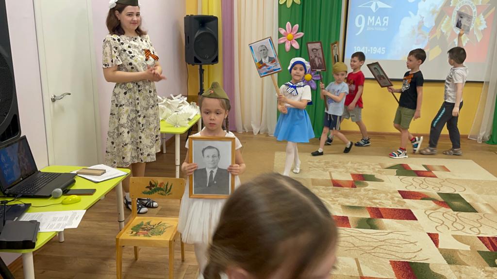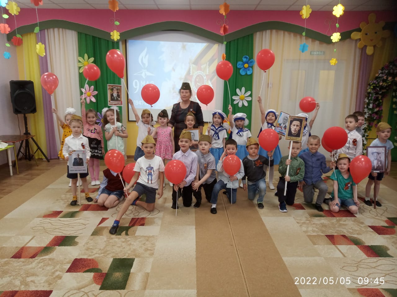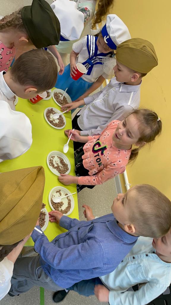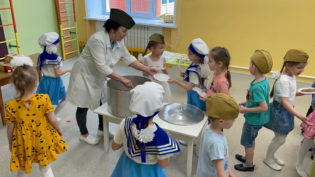 77 лет назад, закончилась Великая Отечественная война. Наш народ победил фашистскую Германию. Сколько книг, сколько стихов и песен написано о великом подвиге русского народа! Много фильмов рассказывает нам о тяжелом послевоенном времени. И в нашем детском саду этот праздник – один из самых любимых праздников в году.Сегодня мы отдаем дань памяти тем, кто погиб на фронтах войны, кто отдал жизнь, чтобы мы жили счастливо. Вспомним всех павших и живых, кто каждую букву в слове Победа освящал и ранами и потерями и жизнью. Вспомним всех, кого у нас отобрала далекая ВОВ.С болью в душе мы скорбим о тех, кто не вернулся с поля боя.Минутой молчания почтили их память, и каждый в душе поблагодарил их за тот счастливый мир, в котором мы живем.Педагоги вместе с воспитанниками организовали шествие "Бессмертный полк".Солдатская каша стала еще одним символом памяти бессмертного подвига советских солдат. Наши повара организовывали полевую кухню с настоящей солдатской кашей.