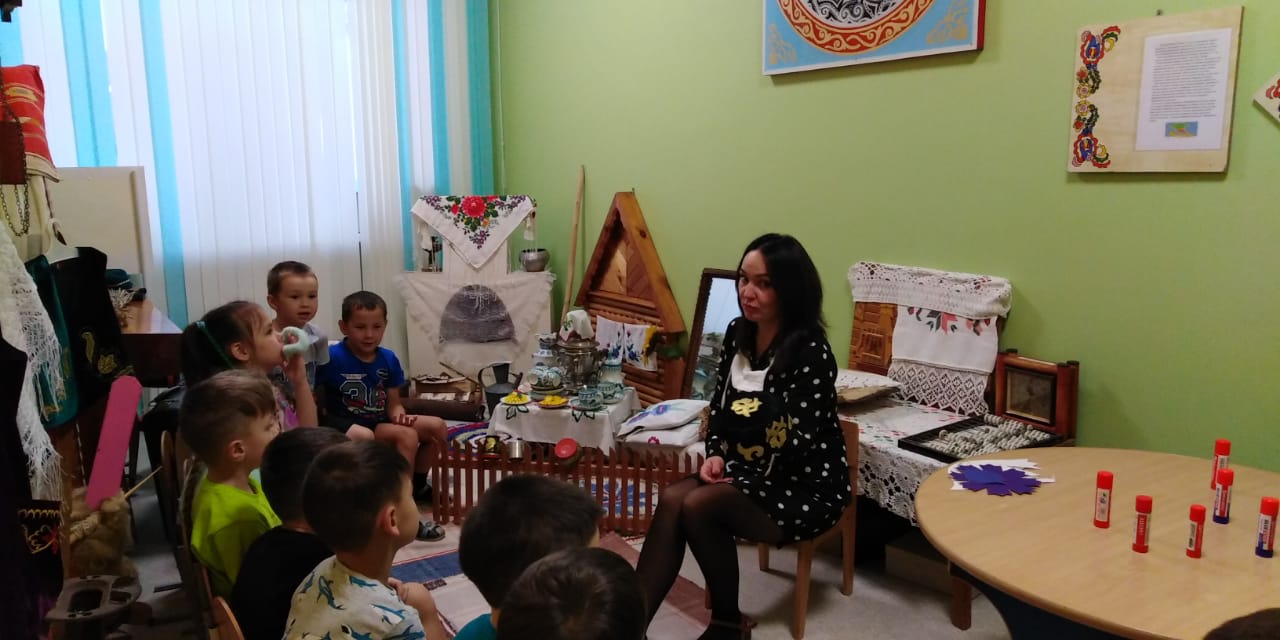 Сегодня дети подготовительной группы №11 посетили мини-музей, расположенный в детском саду.Ребята получили представление о том,что такое музейный экспонат, увидели национальную одежду, посуду,вышитые полотенца и другие предметы быта.Закрепили знания о татарском орнаменте.Знакомство с татарским орнаментом раскрывает перед детьми яркую и неповторимую страницу художественного творчества народа.В конце занятия дети преобразились в дизайнеров.Красили тюбетейки и фартуки элементами народных орнаментов.