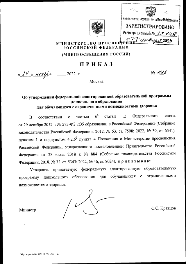 Приказ №1022 от 24.11.2022 об утверждении ФАОП ДО