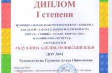 Поздравляем Грушеву Алису Николаевну и ее воспитанников Абдуллину Аделию и Орловского Илью с дипломом 1 степени муниципального робототехничкского конкурса для дтетей старшего дошкольного возраста "Три "Т" Техника.Талант.Творчество" в номинации "Легоград".