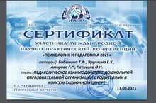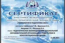 В рамках Международной научно-практической конференции была опубликована статья о работе Консультационного Центра "ПЕДАГОГИЧЕСКОЕ ВЗАИМОДЕЙСТВИЕ ДОШКОЛЬНОЙ ОБРАЗОВАТЕЛЬНОЙ ОРГАНИЗАЦИИ С РОДИТЕЛЯМИ В КОНСУЛЬТАЦИОННОМ ЦЕНТРЕ"