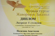 Поздравляем Песигину Анастасию, руководителей Яруллину Д.Г. и Соленову Т.С с победой, лауреатством 1 степени на Международном конкурсе "Чулман Тургае-Жаворонок Закамья" 2021.