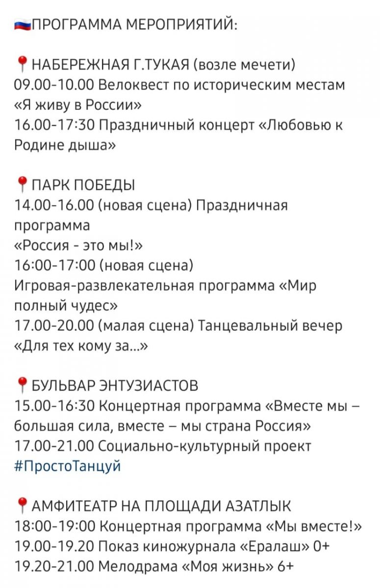 Слава Родине, ура!В нашем городе на разных площадках пройдут праздничные мероприятия. Можно посмотреть афиши - (жми) велоквест, празничный концерт, программа мероприятий.