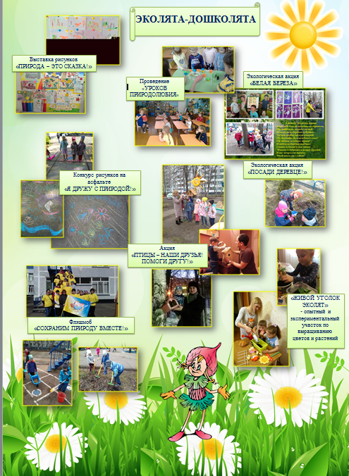 * проведены экологические мероприятия: занятия «Уроки Природолюбия» с «Эколятами» – друзьями и защитниками природы, природоохранные акции «Птицы – наши друзья! Помоги другу!», , флешмоб «Сохраним природу вместе»; выставка-конкурс рисунков «Природа – это сказка!», «Я дружу с Природой!», работа детей совместно с родителями в «Живом уголке Эколят» и др.