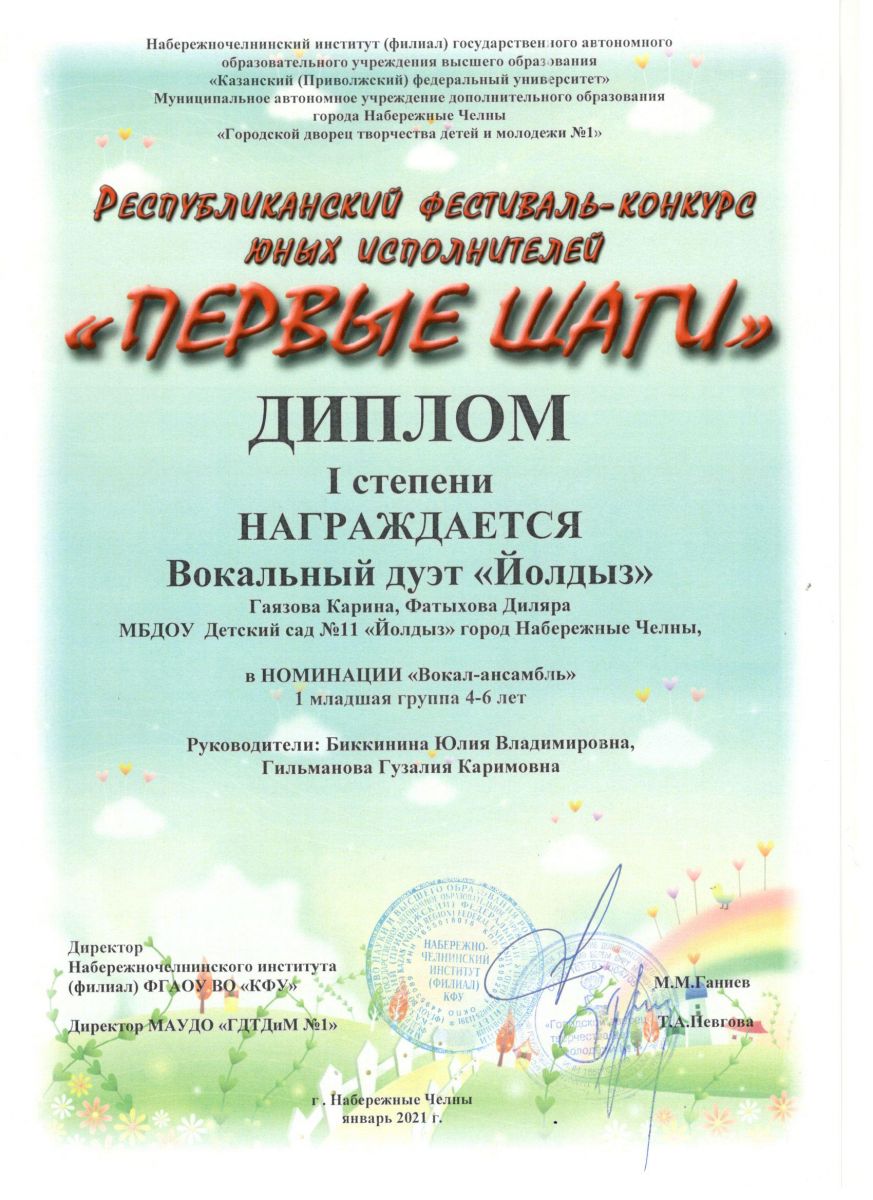 Республиканский фестиваль конкурс "Первые шаги" Диплом 1 степени (2021)