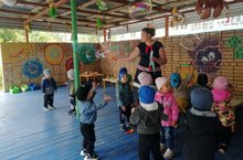Сегодня в нашем ДОУ прошел «Праздник мыльных пузырей». Ребята пели песни, танцевали и играли в разные игры. Дети с восторгом наблюдали как мыльные пузыри переливаются и играют всеми цветами радуги. Весёлые игры, мини-конкурсы, песни и танцы вызвали у детей море положительных эмоций. Праздник получился весёлый, забавный и энергичный.