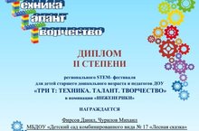 Объявлены победители регионального STEM-фестиваля для детей дошкольного возраста и педагогов ДОУ “ТРИ Т” Техника. Талант. Творчество.” Наши воспитанники Фирсов Данил и Чурилов Михаил в номинации “Инженерики” завоевали 2 место!
