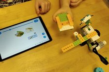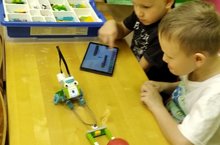 Изобретатели подготовительных групп клуба КИРТ учатся программировать своего робота.