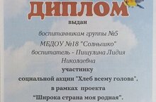 Поздравляем наших педагогов и их воспитанников с получением дипломов участника социальной акции "Хлеб всему голова" в рамках проекта "Широка страна моя родная ". Воспитатель 5 группы Пищулина Лидия Николаевна провела с детьми увлекательную и познавательную беседу о хлебе, в ходе которой ребята рассмотрели зёрна и колоски пшеницы. Воспитатель 3 группы Бойко Светлана Рудольфовна напомнила в ходе бесед ребятам о том, как наши предки выращивали хлеб. Из рассказов Светланы Рудольфовны ребята узнали о том, как много труда вкладывают люди, которые участвуют в производстве хлеба, как из маленького колоска получается ароматный батон, а также какую муку используют пекари для разных хлебобулочных изделий. Воспитатель 6 группы Амосова Татьяна Николаевна продемонстрировала детям видеосюжет о том, как выращивают хлеб, сколько работы нужно проделать, чтобы получить маленькую булочку хлеба. Во время беседы дети узнали о значении хлеба в жизни человека, познакомились с процессом выращивания хлеба, с тем, как хлеб приходит к нам на стол, какие сельскохозяйственные машины помогают людям выращивать хлеб. Наши педагоги познакомили детей с трудом хлеборобов, пекарей и рассказали о других важных профессиях, участвующих в изготовлении хлеба.