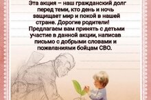 Со всех уголков России идут тысячи писем со словами поддержки участникам спецоперации от детей. Ребята адресуют военнослужащим искренние слова поддержки и благодарности за то, что те защищают их, за то, что борются за мирное небо, за счастливое будущее, рискуя собственными жизнями. Наш детский сад присоединяется к акции "Письмо солдату", в ходе которой ребята могут нарисовать рисунки и написать письма с помощью взрослых. В рамках акции ребята в своих рисунках и письмах могут поздравить военнослужащих с Днём Защитника Отечества. Также бойцов можно порадовать вкусными и тёплыми гостинцами. Пусть этот знак поддержки и радушного привета послужит частичкой душевного тепла и уюта для тех, кто сейчас вдали от дома. Акция проходит с 22 февраля по 1 марта.