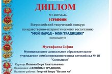 Подведены итоги Всероссийского творческого конкурса по нравственнно-патриотическому воспитанию "Мой народ - мои традиции!". Конкурс был направлен на решение ряда задач, таких, как содействие развитию навыков выразительного чтения, творческого и интеллектуального потенциала обучающихся; развитие художественного вкуса, артистизма, инициативы, стремления к творческой самореализации в области речевого жанра; воспитание высоких чувств гражданской нравственности; бережного отношения к истории Родины, гордости за свой народ у подрастающего поколения. Участникам конкурса предлагалось прочитать наизусть литературное произведение. Наша воспитанница Мустафаева София приняла участие в данном конкурсе, выбрав произведение Георгия Виеру "Патрия мя". София прекрасно справилась с заданием и по итогам конкурса была удостоена диплома I степени. Поздравляем Софию, радуемся успехам и желаем покорения новых вершин!