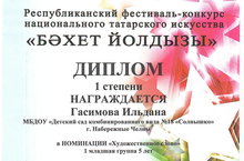 Как же это трогательно и волнительно, когда наши юные таланты-звездочки покоряют сердца зрителей и слушателей, участвуя в городских конкурсах. Наша воспитанница 8 группы Гасимова Ильдана приняла участие в Открытом Региональном фестивале-конкурсе национального татарского искусства "Бэхет йолдызы" и стала обладателем диплома I степени. Поздравляем Ильдану и ее творческих наставников - воспитателя по обучению детей татарскому языку Хаматову Гульниру Минсагитовну и воспитателя Чекалову Татьяну Владимировну, с успехом и желаем им покорять новые вершины!