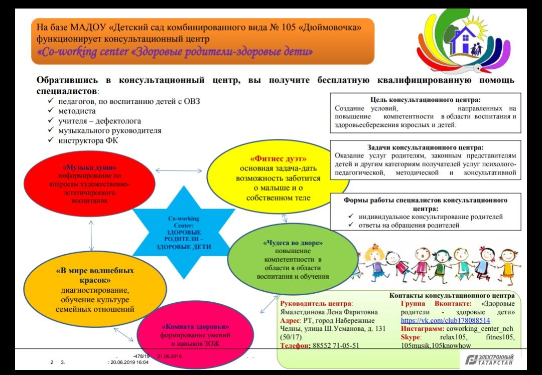 На базе МАДОУ «Детский сад комбинированного вида № 105 «Дюймовочка» функционирует консультационный центр «Co-working center «Здоровые родители-здоровые дети»