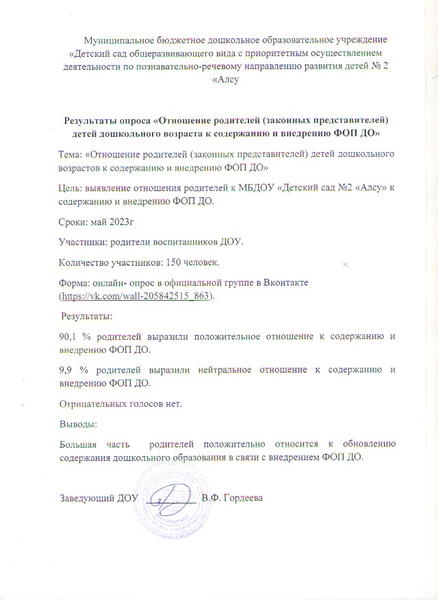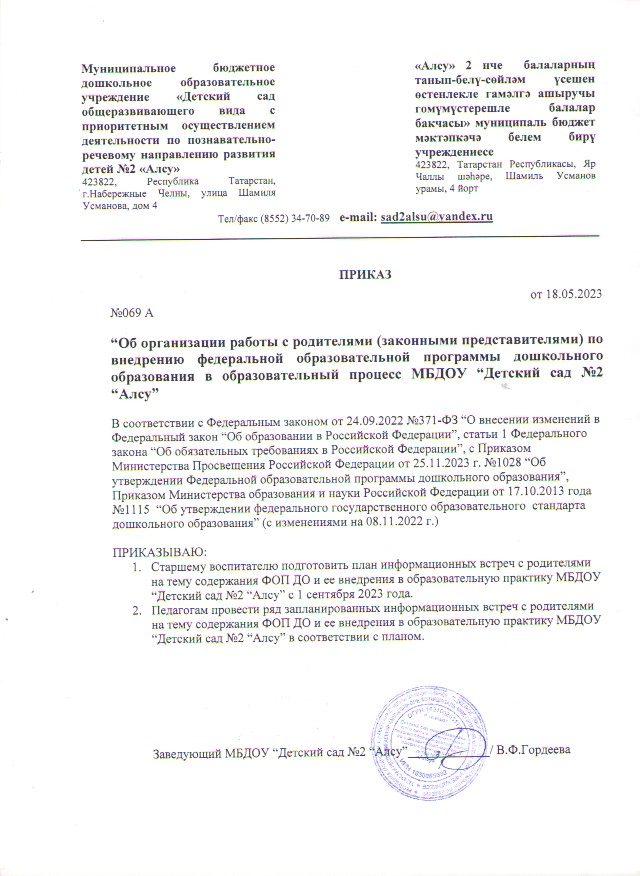 - Приказ «Об организации работы с родителями (законными представителями) по внедрению федеральной образовательной программы дошкольного образования в образовательном процессе МБДОУ «Детский сад №2 «Алсу» от 18.05.2023г
