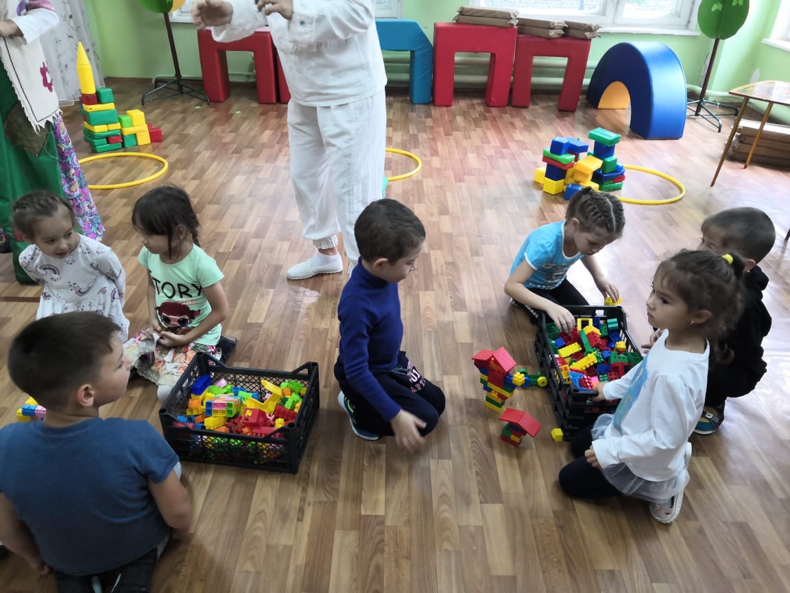 К детям в гости пришли зайчонок и Баба-Яга из сказки, которые помогли детям понять нужность разных строительных профессий, провели с ними разные увлекательные конкурсы и состязания. В группах дети путем конструирования смогли сами построить дома своей мечты.