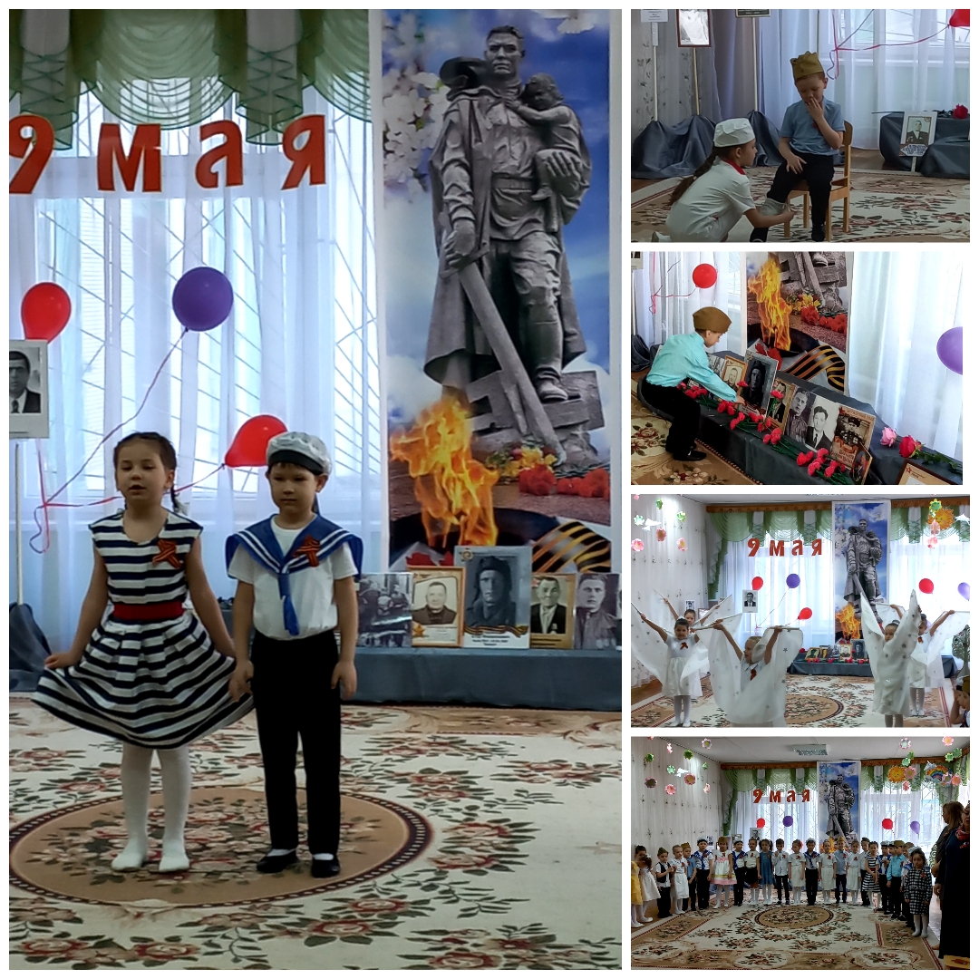 Сегодня в музыкальном зале проводилась музыкально-литературная композиция с приглашением ветеранов труда, которые являются детьми военных лет. Они рассказывали детям о своем детстве, дали наставления. Дошкольники исполняли песни о войне, о мире на Земле; читали стихи. В конце мероприятия дети возложили гвоздики к подножию «памятника» (на банере).