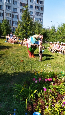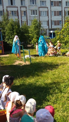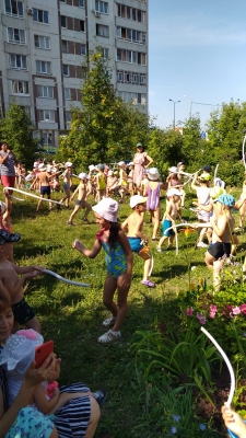 Ребята с интересом играли в различные аттракционы с водой «Фонтан» и «Меткий стрелок» Игры с водой были не только захватывающими, но и полезными для здоровья!Дети были рады встрече с могучим властелином морей и океанов царём Нептуном и Водяной. Дети получили массу положительных эмоций и хорошее настроение на весь день!