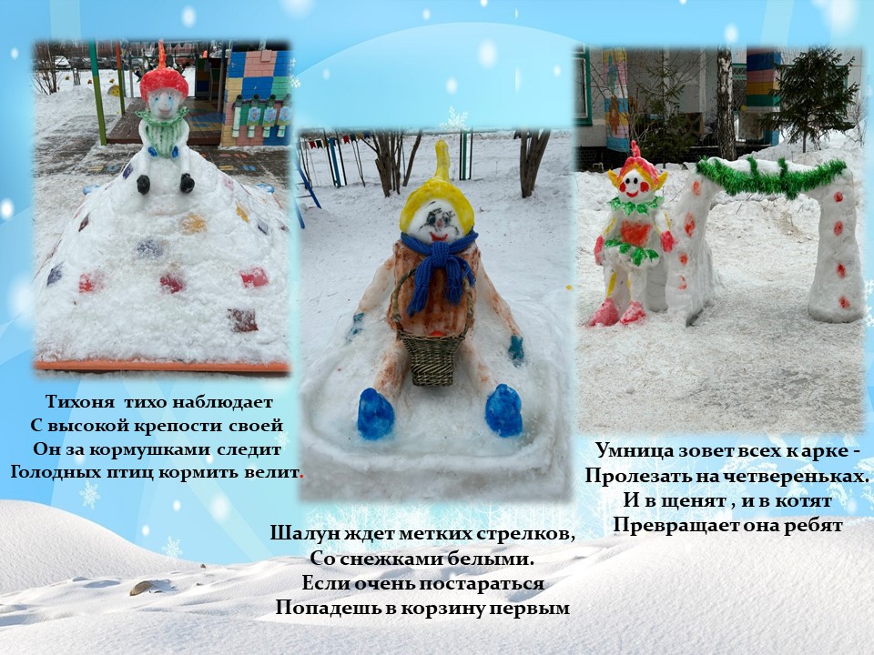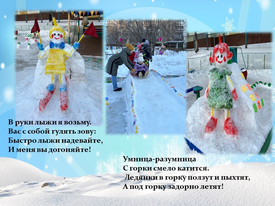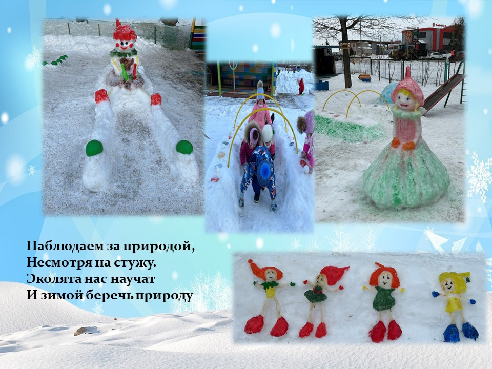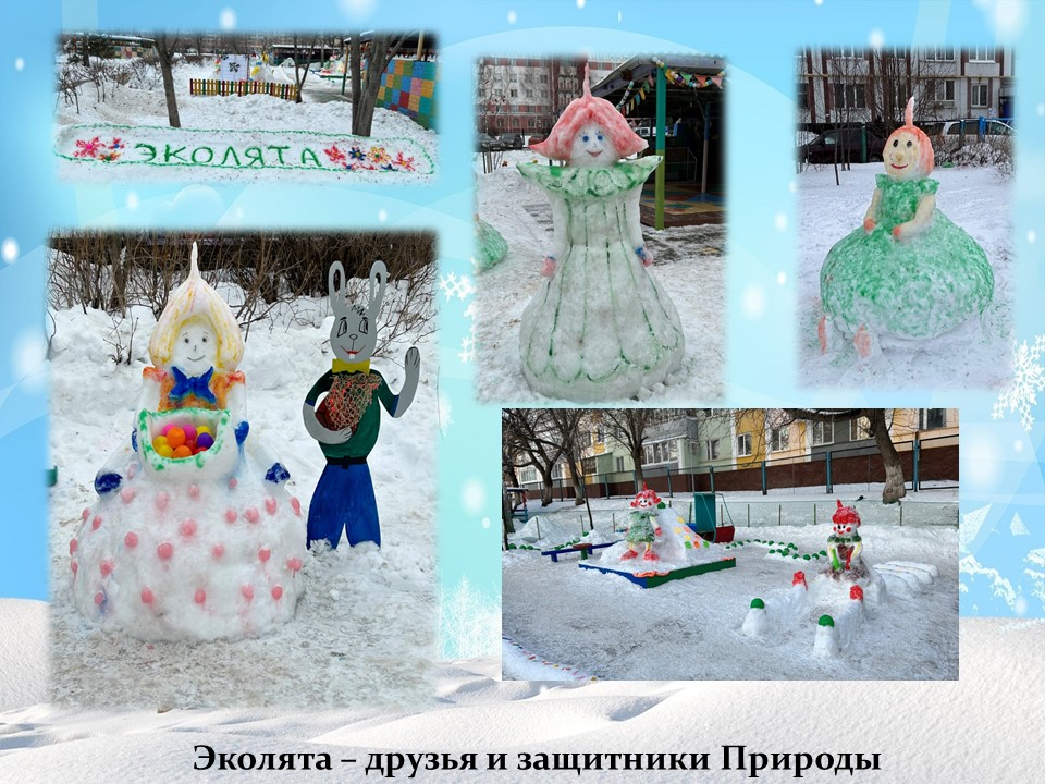 Снежный городок вызывает у ребят положительный эмоциональный настрой, желание идти на прогулку и скорее навестить своих сказочных друзей. Снежные постройки способствуют не только физическому развитию детей, но и положительному эмоциональному настрою на двигательную активность во время прогулки. Дошкольники с удовольствием обыгрывают снежные постройки, которые не только вносят разнообразие в детские игры, но и развивают художественный вкус. А также, дети активно принимают участие в природоохранной и экологической деятельности. Эколята помогают подружиться с природой, понять и полюбить её.