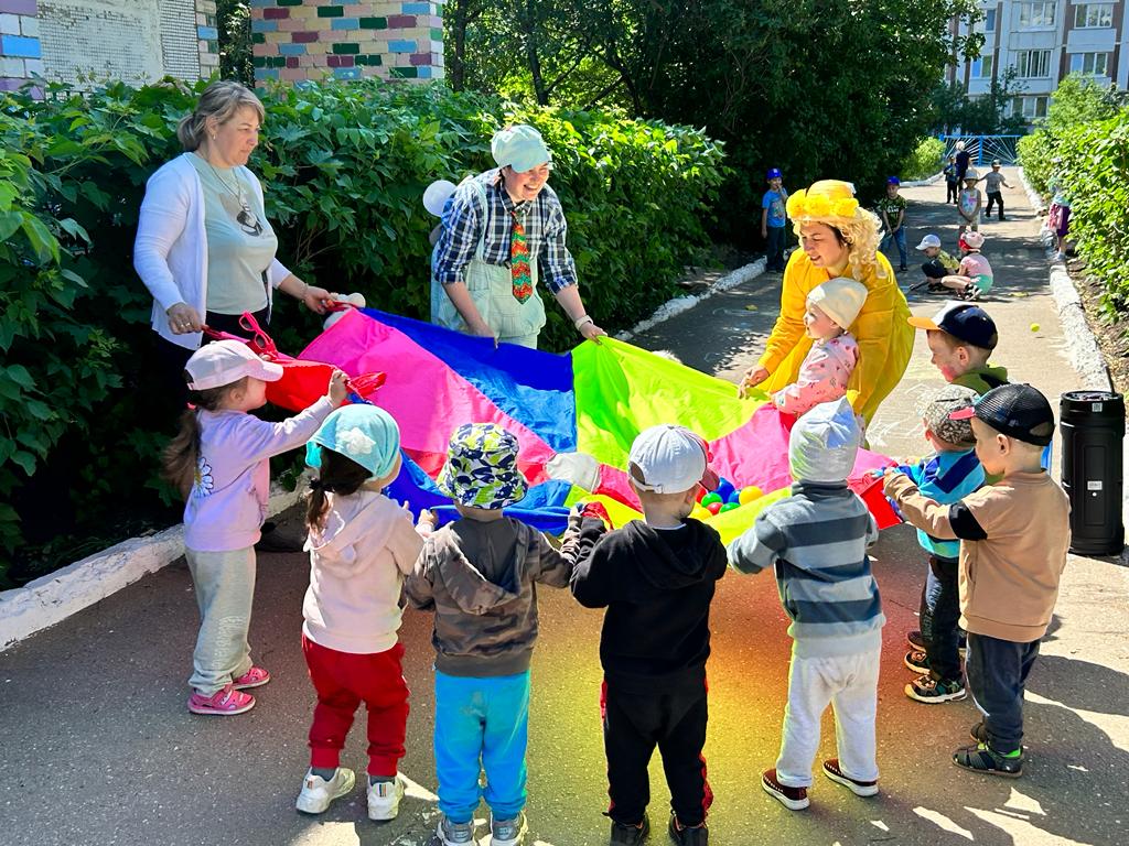Опубликовано: 01.06.2023Радостно, звонко, тепло и красочно прошёл главный праздник детства – День защиты детей в детском саду №2 «Алсу». В гости к воспитанникам пришли персонажи Карлсон и Солнышко. Вместе с гостями, ребята участвовали в играх, читали стихи про безоблачное детство, пели песни о дружбе, танцевали.