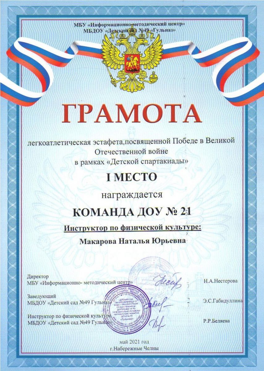 Мы поздравляем команду нашего детского сада с победой в легкоатлетической эстафете, посвященной победе в ВОВ в рамках "Детской спартакиады".