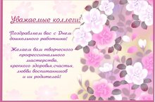Дорогие наши коллеги! Пускай под крышей нашего любимого детского сада всегда царит добрая, светлая и хорошая атмосфера. Пускай в стенах этого дома каждому будет уютно, тепло и спокойно. Спасибо вам за то, что благодаря вашей слаженной и четкой работе, вашим огромным, добрым сердцам, теплым и нежным рукам, мы все, вместе с нашими воспитанниками, чувствуем себя одной большой семьей. Желаю каждому из вас всегда чувствовать себя счастливым и всегда находить повод для улыбки. С праздником!