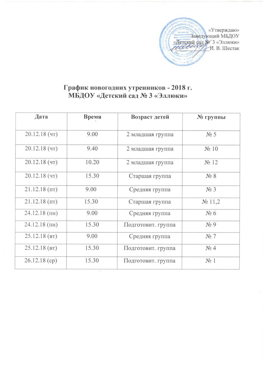 Опубликовано: 18.12.2018Уважаемые родители! Приглашаем Вас на новогодние утренники, которые состоятся в музыкальном зале ДОУ с 9.00 20.12.2018 согласно утверждёному графику проведения. Мы вас ждём!