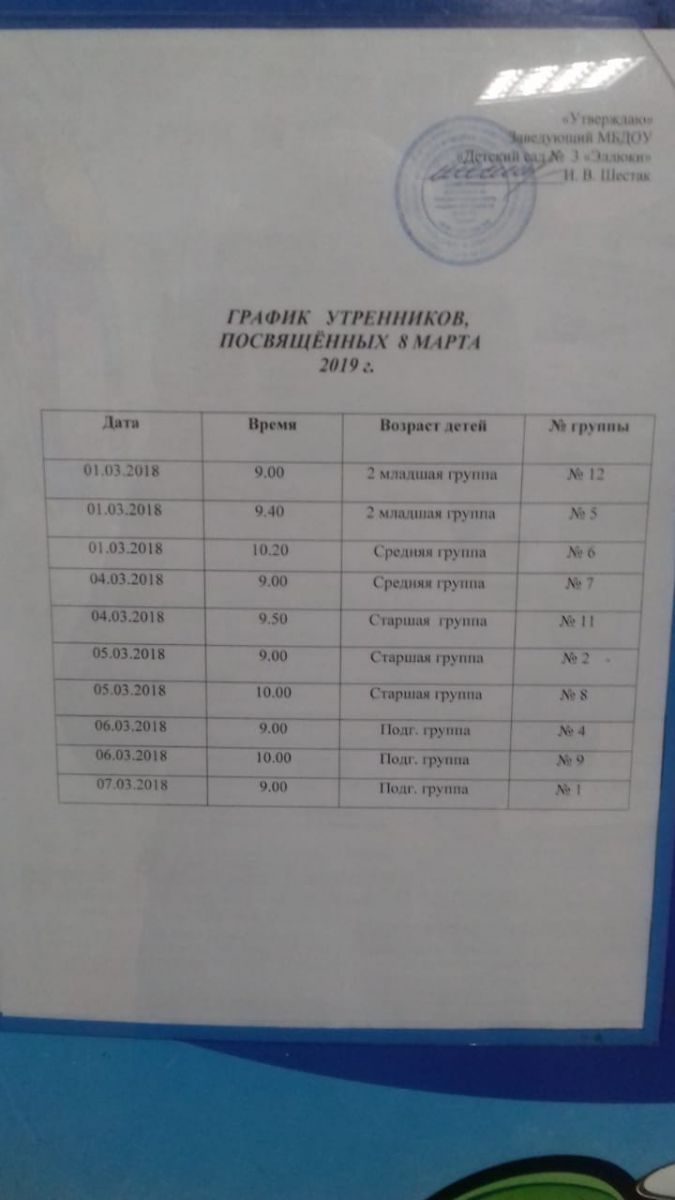 Опубликовано: 28.02.2019Дорогие мамы! Приглашаем Вас на утренники, посвящённые 8 марта, которые состоятся с 01.03.2019 по 07.03.2019 согласно утвержденному графику.