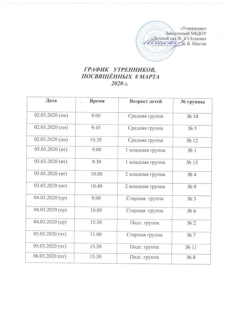 График утренников посвященных Дню 8 марта