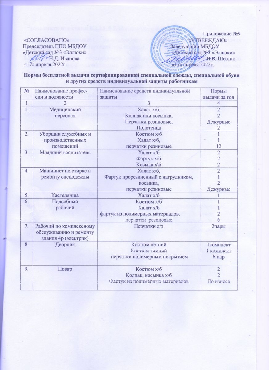 Изменение и дополнение в коллективный договор 2022г Приложение № 9