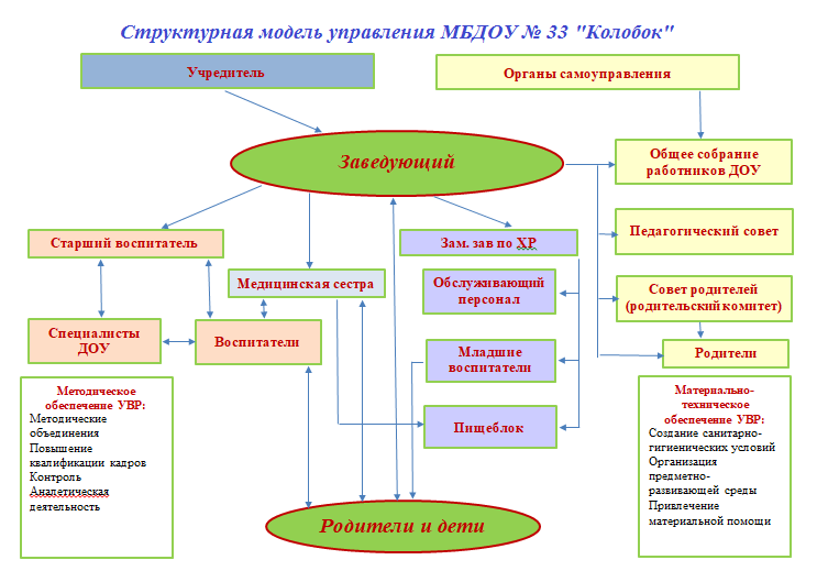 Управление Детским садом строится на принципах единоначалия и коллегиальности. Единоличным исполнительным органом является руководитель – заведующий. Коллегиальными органами управления являются: управляющий совет, педагогический совет, общее собрание работников.