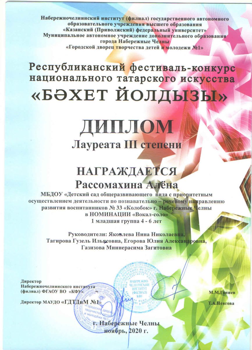 Республиканмский фестиваль -конкурс национального татарского искусства Бәхәт йолдызы Диплом 3 степени  Рассомахина Алёна