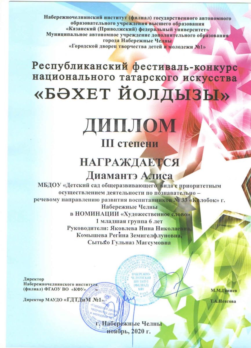 Республиканский фестиваль-конкурс национального татарского искусства Бәхет йолдызы. Диплом 3 степени, Диамантэ Алиса