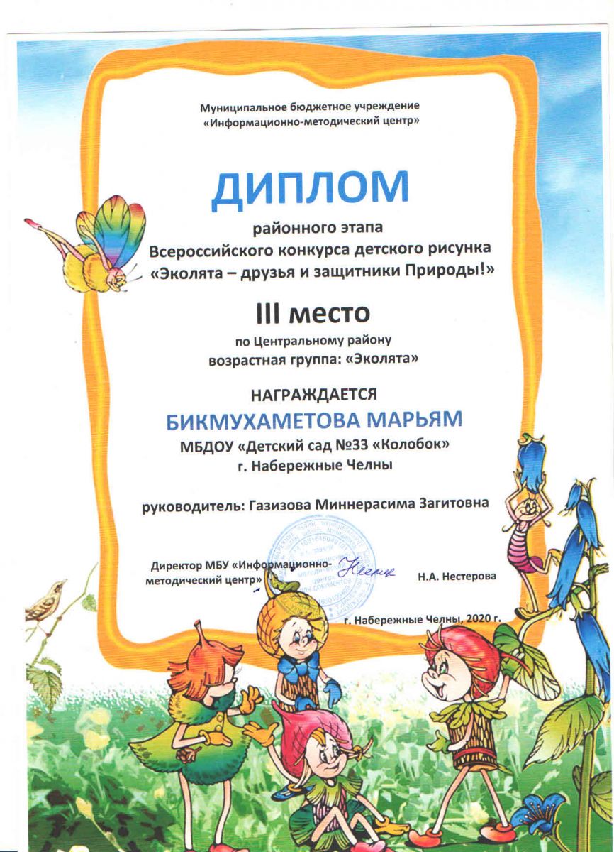 Всероссийский конкурс детского рисунка "Эколята-друзья и защитники Природы!" Диплом 3 степени Бикмухаметова Марьям