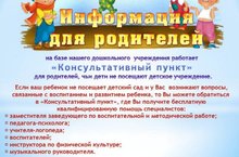 В ДОУ работает консультационный пункт, который принимает неорганизованных детей раннего возраста, и детей старшего дошкольного возраста нуждающихся в психологической и логопедической консультации. 01.10.2020