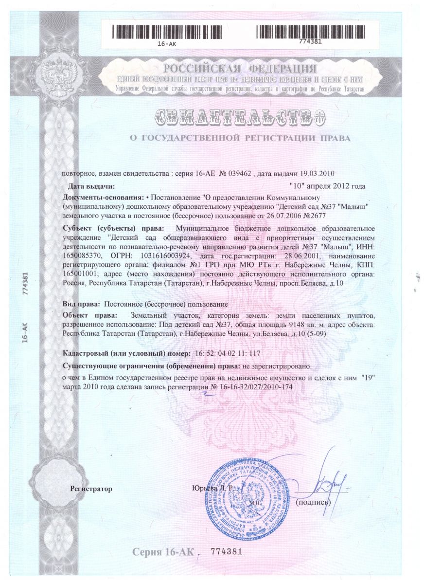 Муниципальное бюджетное дошкольное образовательное учреждение «Детский сад общеразвивающего вида с приоритетным осуществлением деятельности по познавательно-речевому направлению развития детей № 37 «Малыш» г.Набережные Челны Республики Татарстан