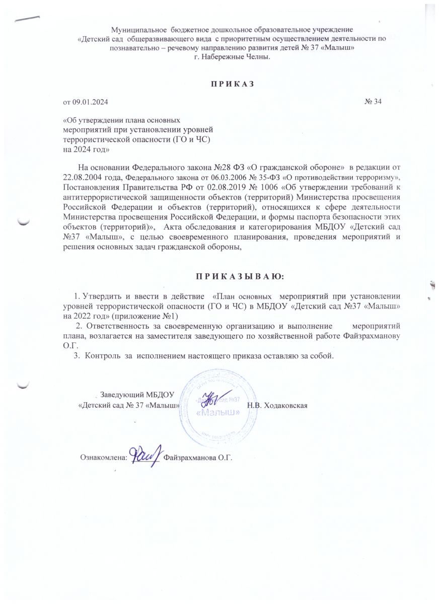 Приказ №34 Об утверждении плана основных мероприятий при установлении уровней террористической опасности (ГО и ЧС) на 2024 год.jpg