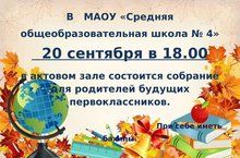 В МАОУ "Средняя общеобразовательная школа №4" 20 сентября в 18.00 в актовом зале состоится собрание для родителей будущих первоклассников.