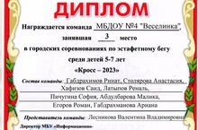 Сегодня, 17.05.2023 года воспитанники подготовительных к школе групп № 3, 10 Габдрахимов Ринат, Столярова Анастасия, Хафизов Саид, Латыпов Реналь, Пичугина София, Абдулбарова Малика, Егоров Роман, Габдрахманова Ариана участвовали в Городских соревнованиях по эстафетному бегу среди детей 5-7 лет "Кросс-2023", награждены дипломом 3 степени! Поздравляем! Благодарим за подготовку детей инструктора по физической культуре Лесникову Валентину Владимировну!