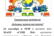 24 сентября в 18.00 в актовом зале МАОУ СОШ №4 состоится родительское собрание для будущих первоклассников.