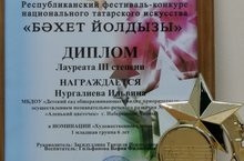 Воспитанники нашего детского сада принимали участие в Республиканском фестивале-конкурсе национального татарского искусства "БӘХЕТ ЙОЛДЫЗЫ". Спешим поздравить наших маленьких звездочек! Поздравляем НУРГАЛИЕВУ ИЛЬВИНУ, воспитанницу группы №2! Она удостоилась диплома лауреата III степени. Руководитель: Загидуллина Т.И.