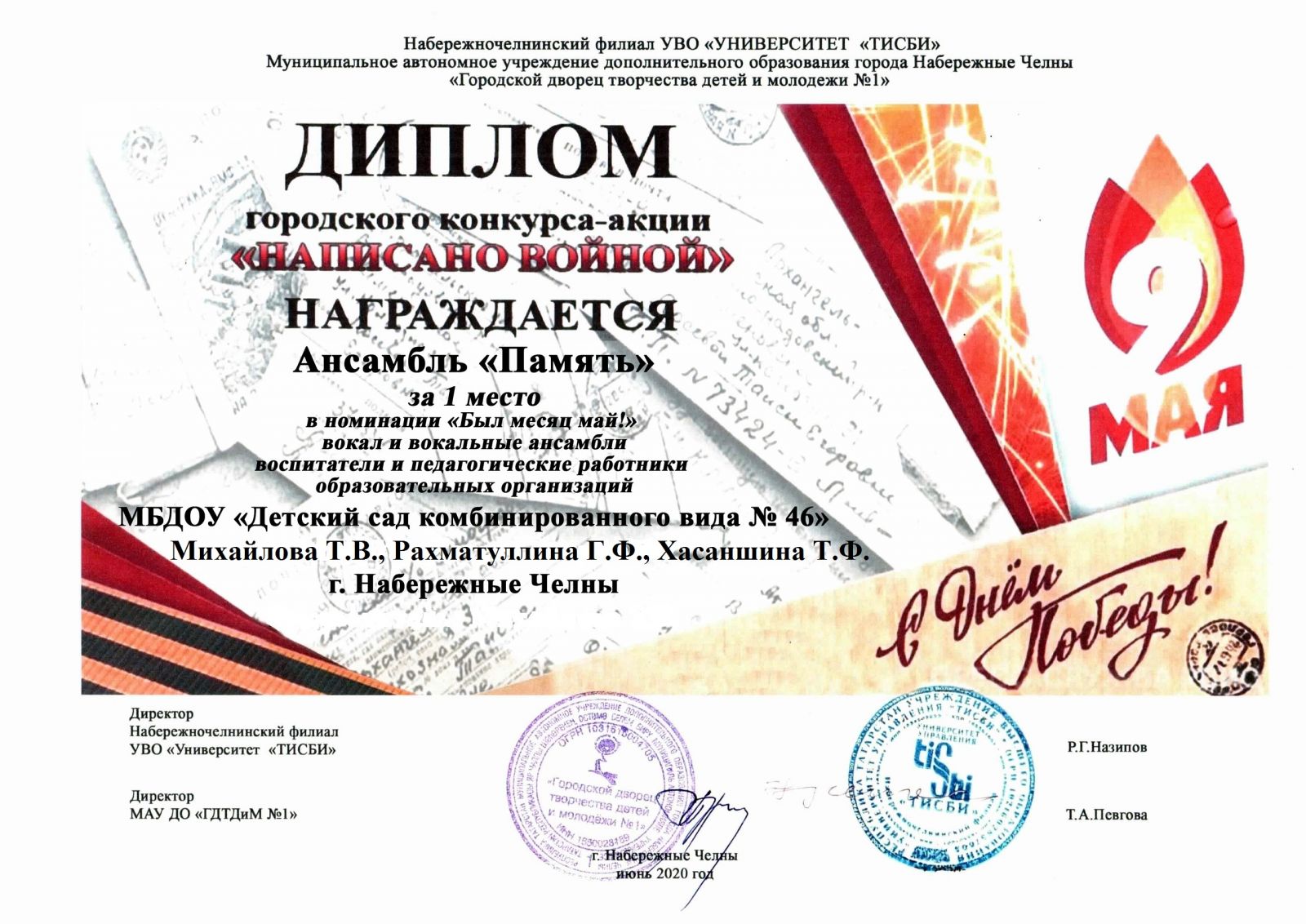 Диплом 1 место городского конкуса-акции "Написано войной"2020